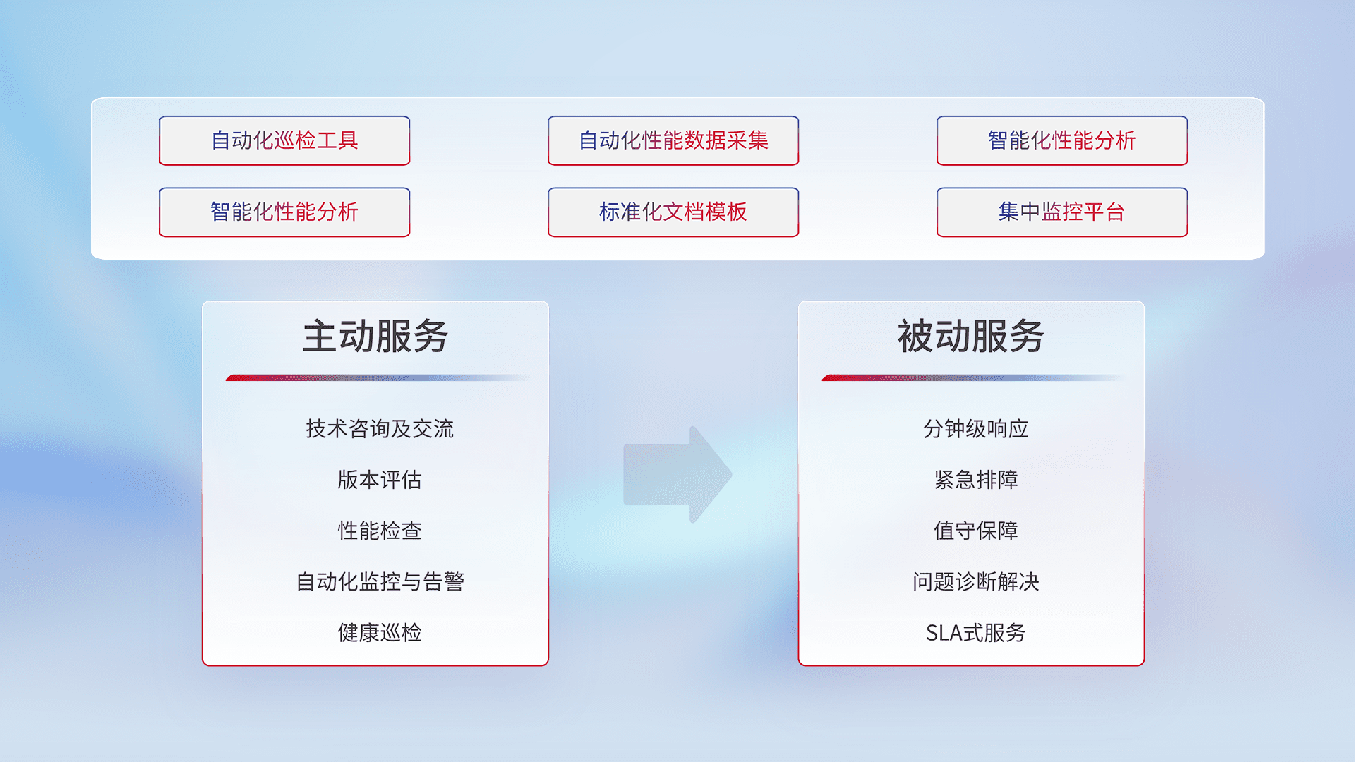 智能化工具和标准化文档,,保障服务质量,,,,提供主动服务(包含技术咨询、、、、版本评估、、性能检查、、、自动化监控与告警、、、健康巡检)和被动服务包含(分钟级响应、、、、紧急排障、、值守保障、、问题诊断解决、、、、SLA服务)。。。